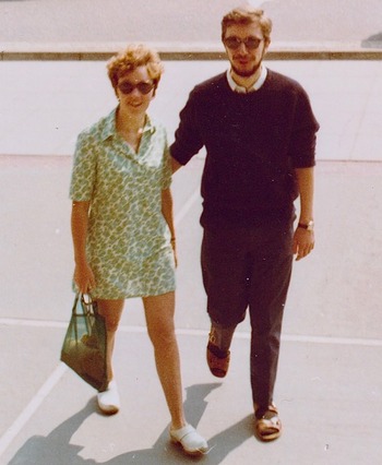 Peter and his wife, Sandra, walking into Norwich Library, 1970.